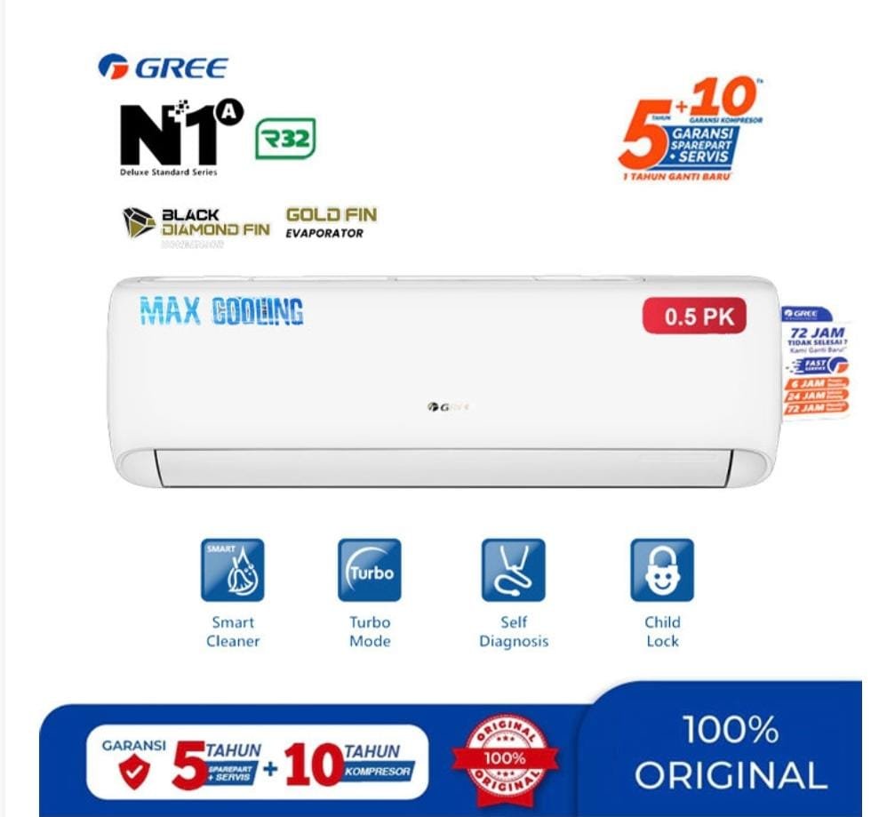 GREE AC DELUXE STANDARD N1A SERIES R32 hadir dengan teknologi canggih untuk menghadirkan kesejukan optimal dan daya tahan tinggi. Dirancang untuk bekerja secara efisien bahkan dalam kondisi cuaca ekstrem. Dilengkapi dengan teknologi I-Cool unit outdoor-nya tetap bisa bekerja optimal meski suhu mencapai 50°C, lapisan anti-korosi Black Diamond dan Gold Fin Evaporator, Smart Cleaner, Turbo Mode, Self Diagnosis, Child Lock, Snow Breeze, I-Feel, Filter DIY HD, X-Fan, dan 4 Protection.